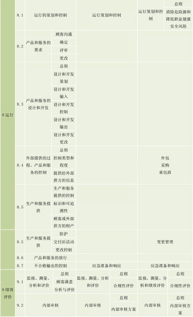 在國內(nèi),組織都是將各個(gè)管理體系進(jìn)行整合,質(zhì)量、環(huán)境、職業(yè)健康安全管理體系作為ISO標(biāo)準(zhǔn),均使用了高階結(jié)構(gòu),為體系的整合提供了便利。表2將三個(gè)體系的框架進(jìn)行了對應(yīng)于合并,可供讀者參考。